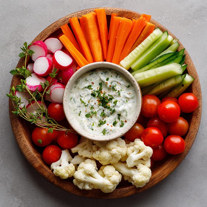 Conçu pour régaler jusqu’à 20 personnes, ce plateau généreux met à l’honneur une sélection de légumes de saison découpés avec soin : concombre, carottes, tomates cerises, chou-fleur et radis. Le tout accompagné d’une savoureuse sauce tzatziki pour une touche onctueuse et rafraîchissante.